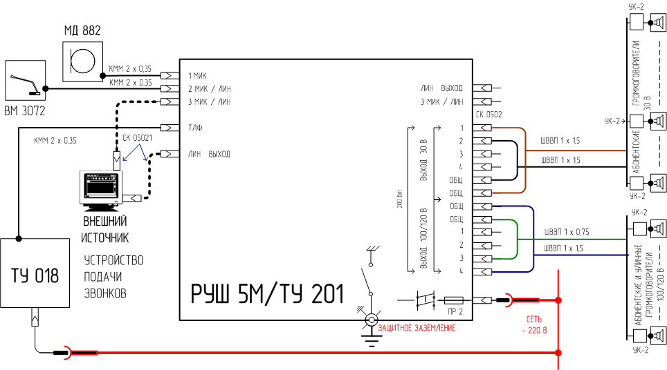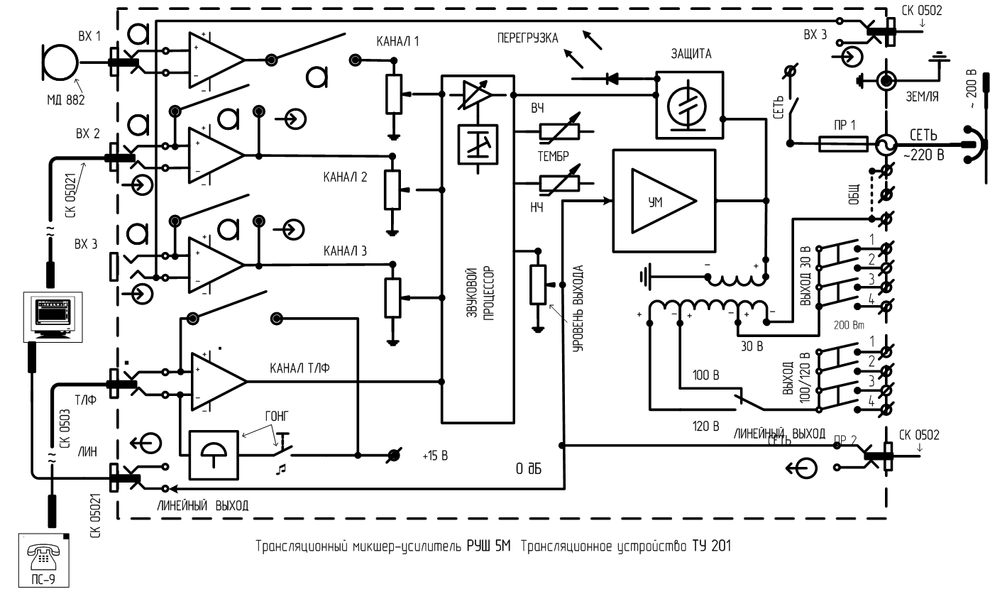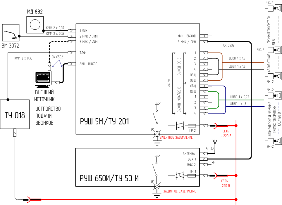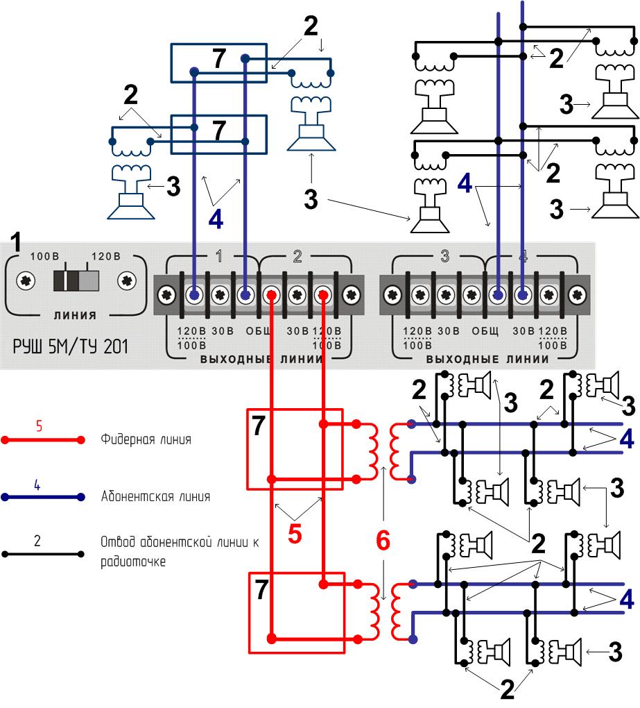 Рис. 7. Трансляционный микшер-усилитель РУШ 5М. Трансляционное устройство ТУ 201. Вариант схемы подключения линий. Для увеличения - нажмите. Где