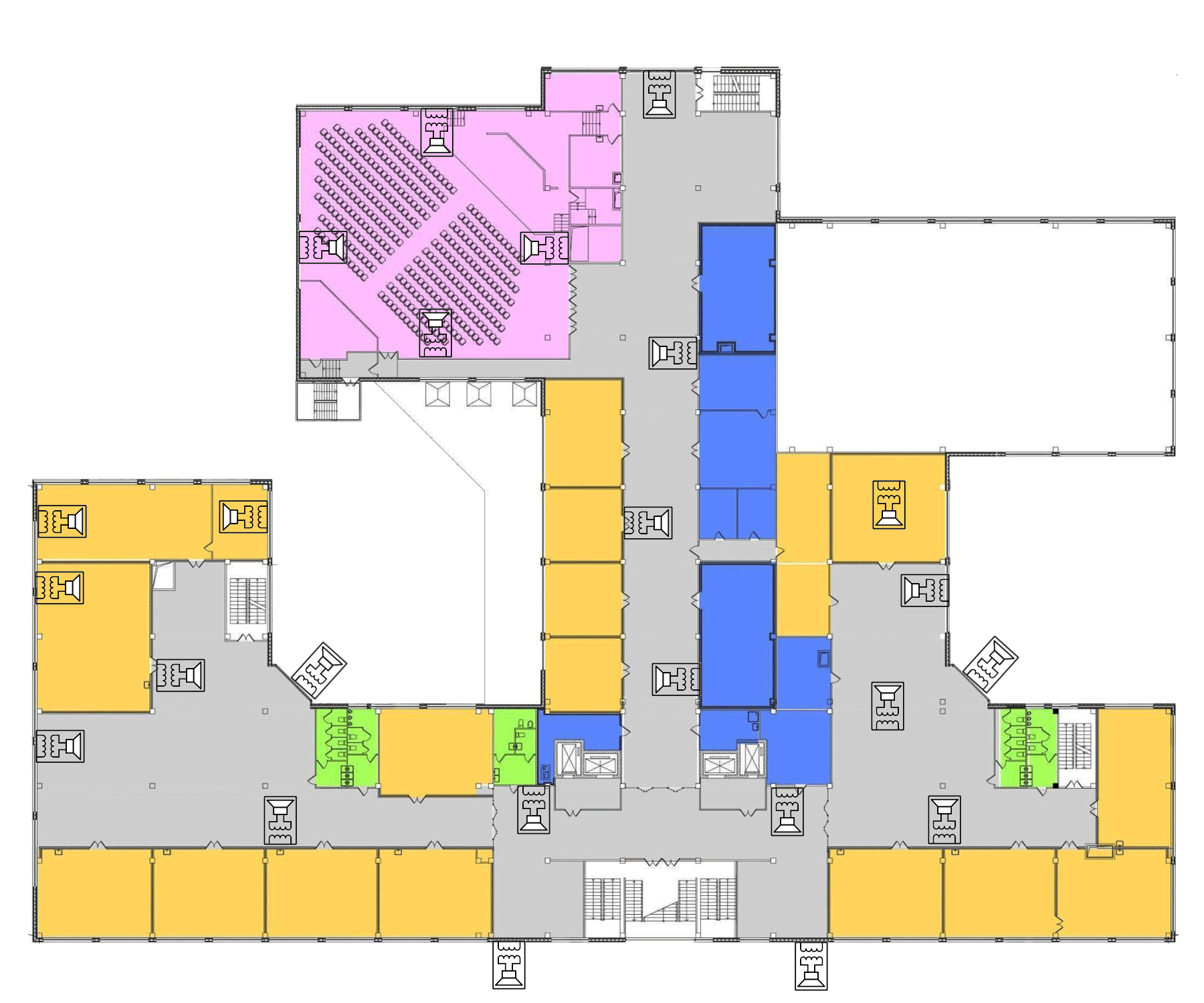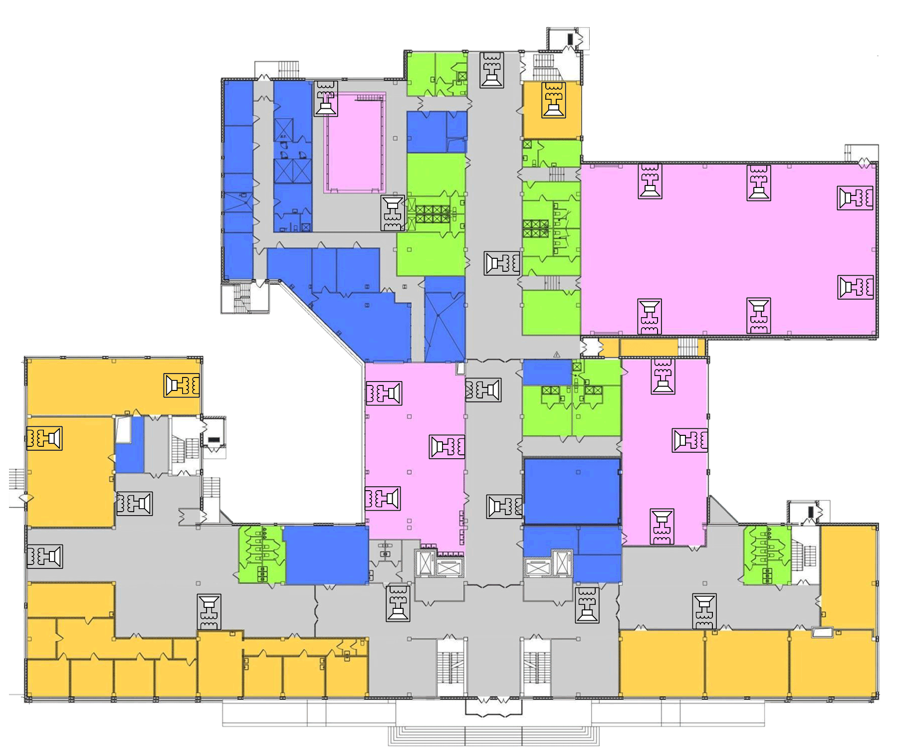 Эта планировка будет исходным материалом для всей дальнейшей работы по компановке (расчету) школьного радиотрансляционного узла. Обозначим на планировке озвучиваемые помещения и определим требуемые абонентские устройства. Вернее — их мощности или тип. Это — не совсем корректно, так как иногда необходимы несколько громкоговорителей различного типа для озвучивания одного помещения. Тем не менее в 90% случаев это работает.