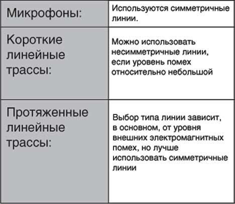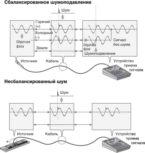Еще одно место, где практически всегда используются симметричные линии, — это микрофонные кабели. Причина в том, что выходной сигнал большинства микрофонов очень слаб, поэтому даже незначительные помехи будут для них относительно серьезны, а после прохождения предварительного усилителя микшера усилятся до опасной степени.